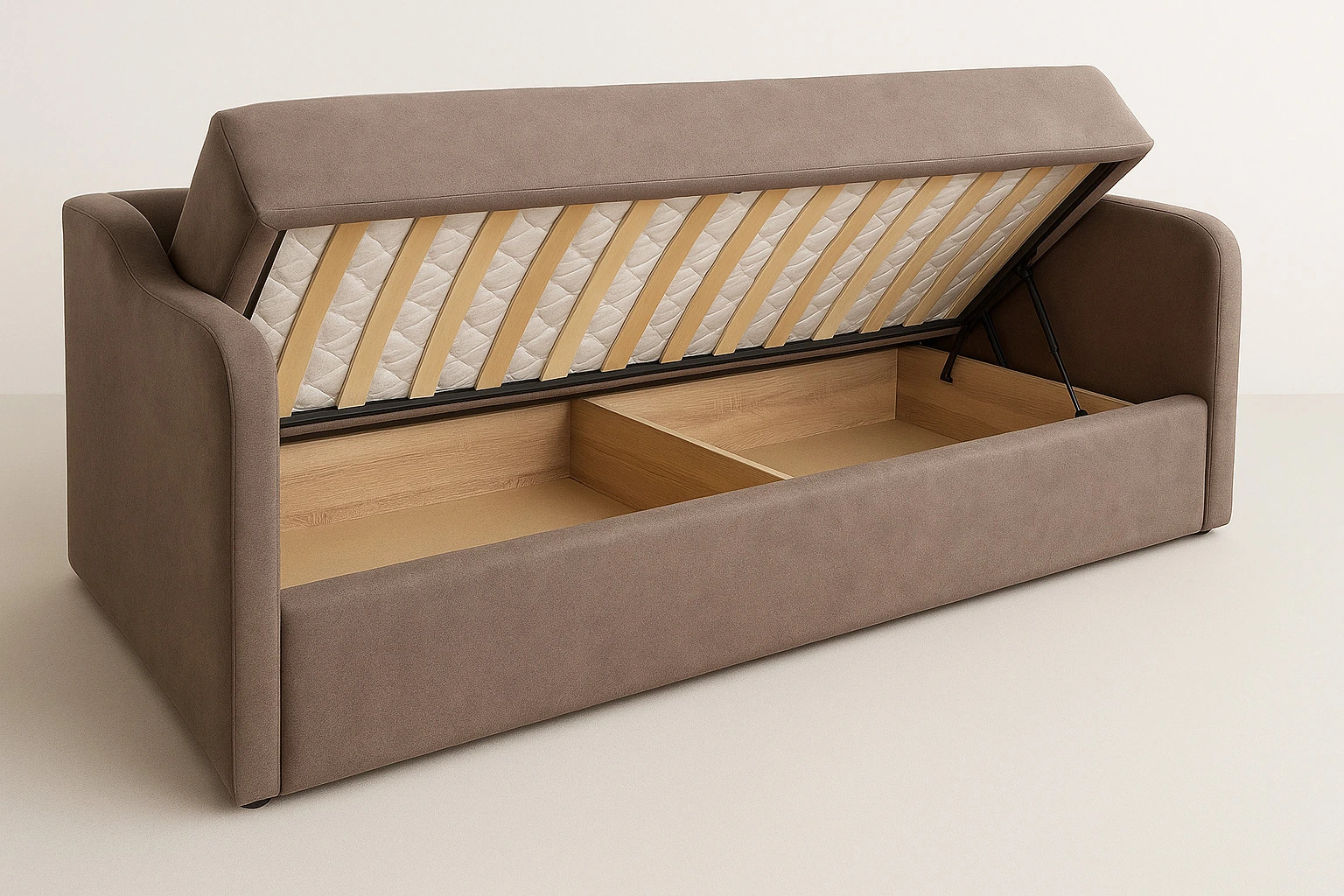 | Сканди/Japandi | Прямой на высоких опорах | Микровелюр, беж/грейж | Деревянная консоль, льняные шторы |